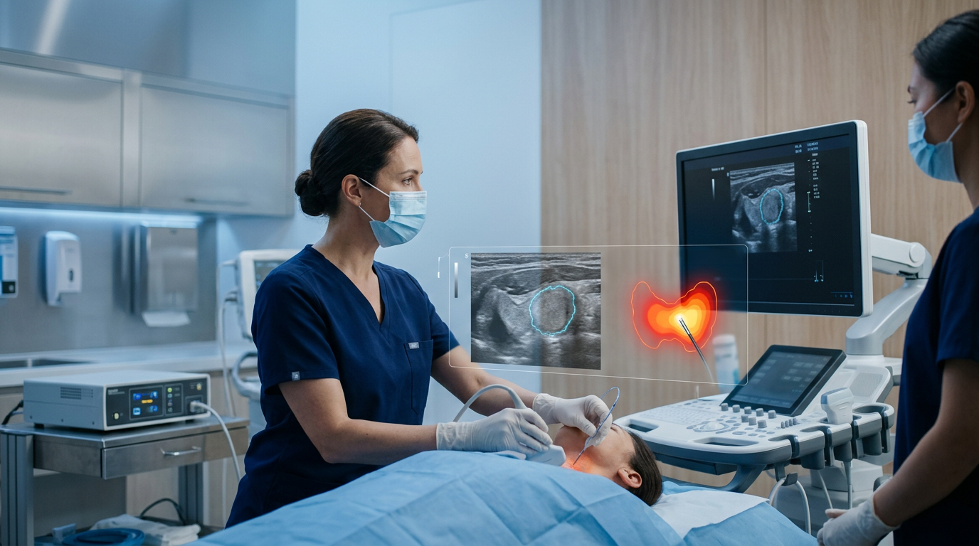 Thyroid cancer is most often papillary in origin and is frequently associated with a favourable prognosis when identified and managed appropriately. Some patients present with low-risk papillary thyroid microcarcinoma, where the cancer remains small and confined, while others may develop recurrent disease or cervical lymph node metastasis that requires further local control after previous treatment. In both situations, management must be carefully individualised, taking into account the size and position of the disease, nearby vital neck structures, prior therapies, and the patient’s broader clinical needs. For selected cases, a focused minimally invasive approach may offer an important option for local disease management while supporting preservation of surrounding tissue and overall treatment continuity.